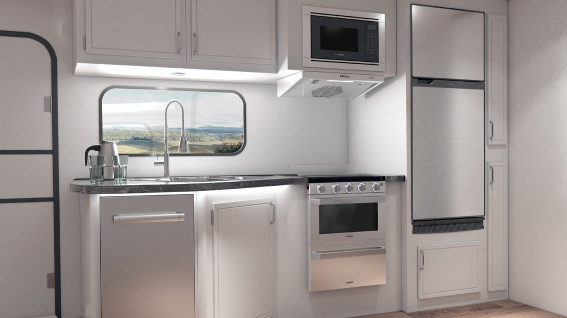 Built-in is an optional customisation in your traditional home kitchen, but it's a must in an RV. Built-in appliances save space and optimize the organisation of your RV kitchen. Even refrigerators, which are most often stand-alone in a traditional kitchen, are built-in within RVs. Furrion appliances are designed to be installed seamlessly into these built-in setups.
